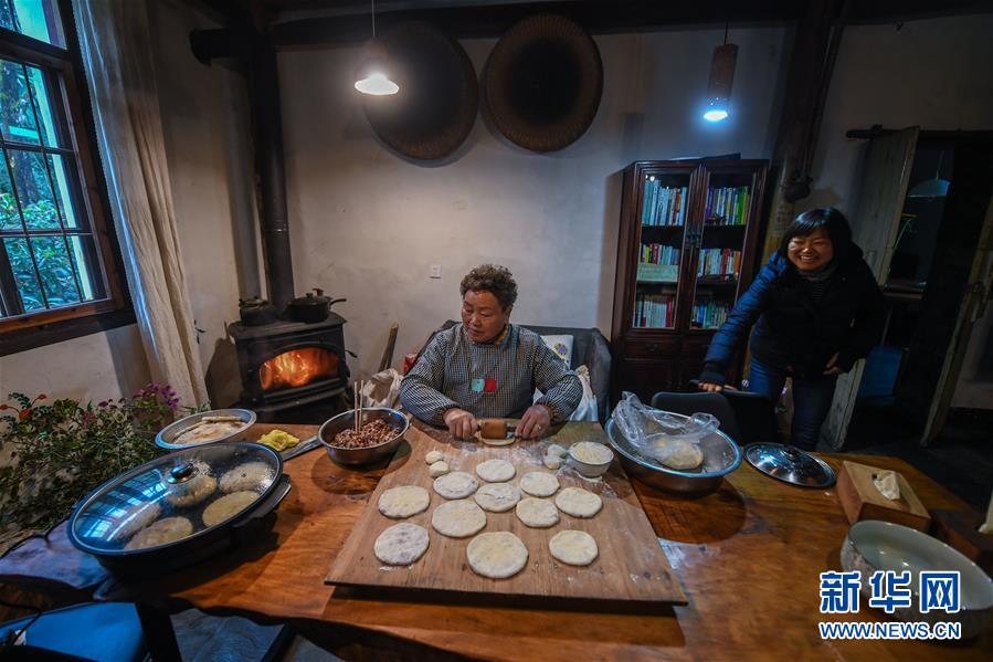 12月19日,民宿“僻地寒楼”的主人张雁(右)和妈妈在制作特色美食。该民宿共有7幢风格各异的小屋分布在山坡上,颇具特色。河桥镇青年张雁辞去了上海的工作,回到家乡开办了这家民宿。 新华社记者 徐昱 摄