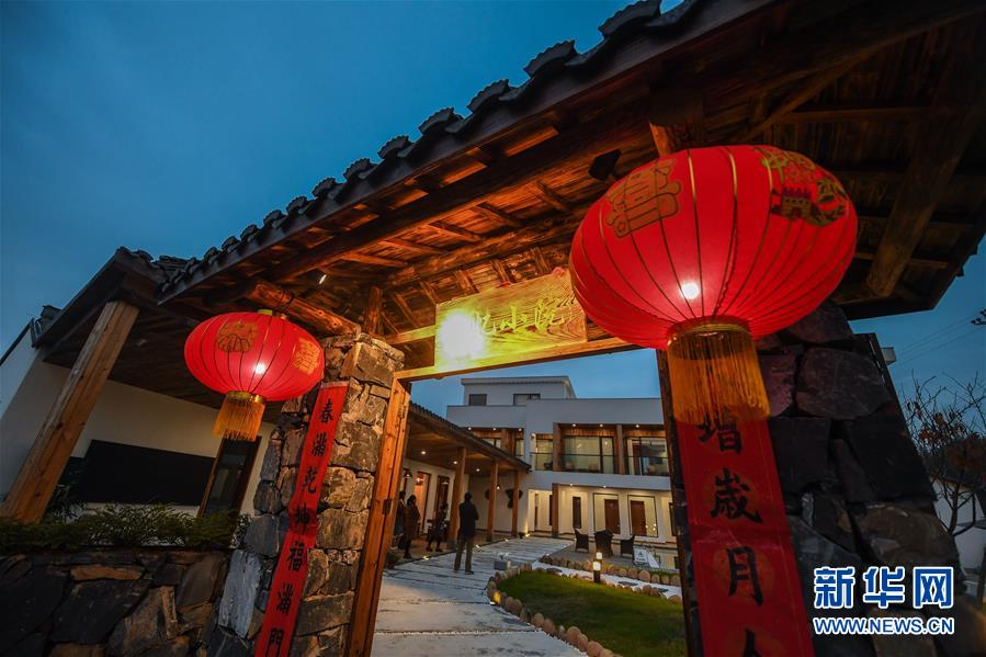 夜色中的民宿“初忆小院”(12月19日摄)。该民宿是河桥镇“90后”女孩章淑贞开办的,民宿融入了大量的现代建筑设计风格,深受年轻人的喜爱。 新华社记者 徐昱 摄