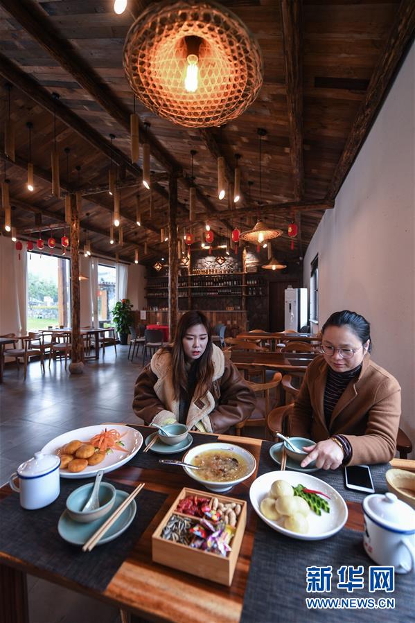 12月19日,章淑贞(左)在民宿“初忆小院”内请一名客人品尝自己做的点心。该民宿是河桥镇“90后”女孩章淑贞开办的,民宿融入了大量的现代建筑设计风格,深受年轻人的喜爱。 新华社记者 徐昱 摄
