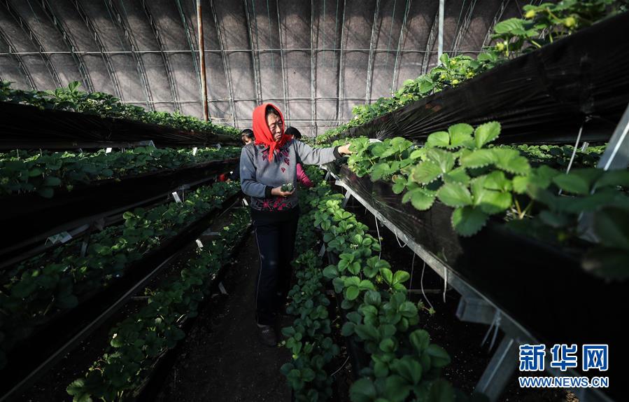 12月19日,农户在大棚里管理草莓。 2017年5月,辽宁省铁岭市昌图县大四家子镇方家船口村利用土地确权成果,由村两委班子成员领办创办了昌图久晟果木蔬菜种植专业合作社。到2018年9月,合作社利用产业扶贫资金、壮大村集体经济扶持资金、村集体用地和村民入股资金建成了11个“股份制大棚”,主要种植草莓等作物,产品通过电商销往云南、四川、北京、上海等地,预计第一期可为265名贫困户每人分红860元。 新华社记者潘昱龙摄
