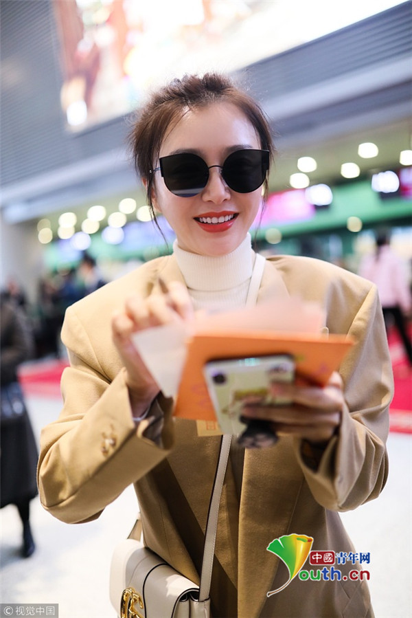 秦岚穿星星外套活力四射 架黑超涂红唇笑靥如花