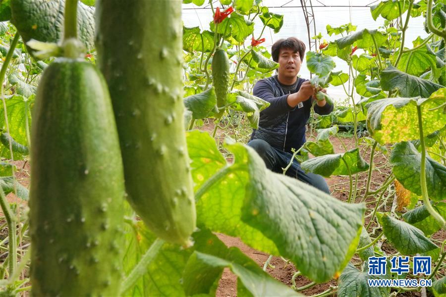 12月20日,唐山市丰润区百草坡农产品农民专业合作社社员在大棚内管护黄瓜。