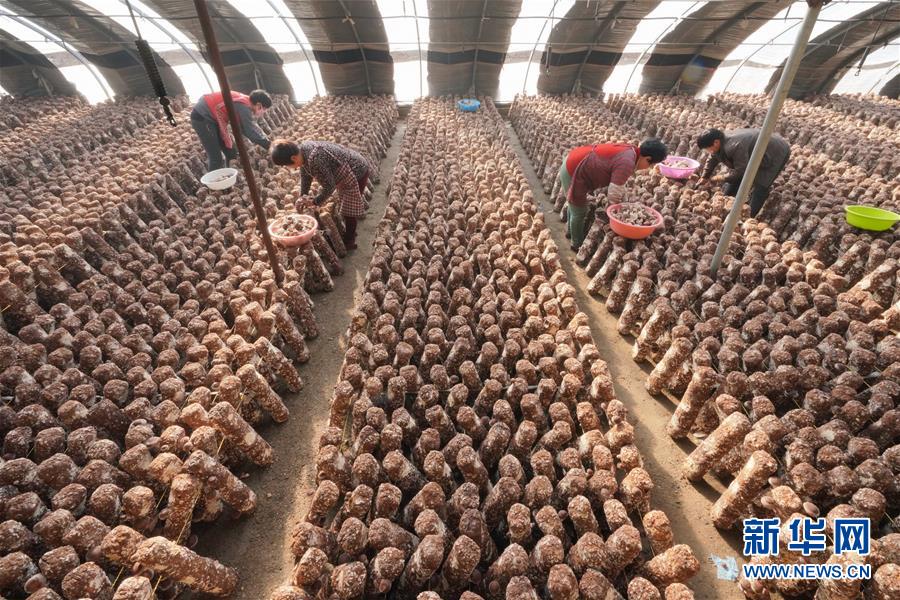 12月20日,唐山市丰润区小美食用菌种植农民专业合作社社员在大棚内采摘香菇。 新华社记者 牟宇摄