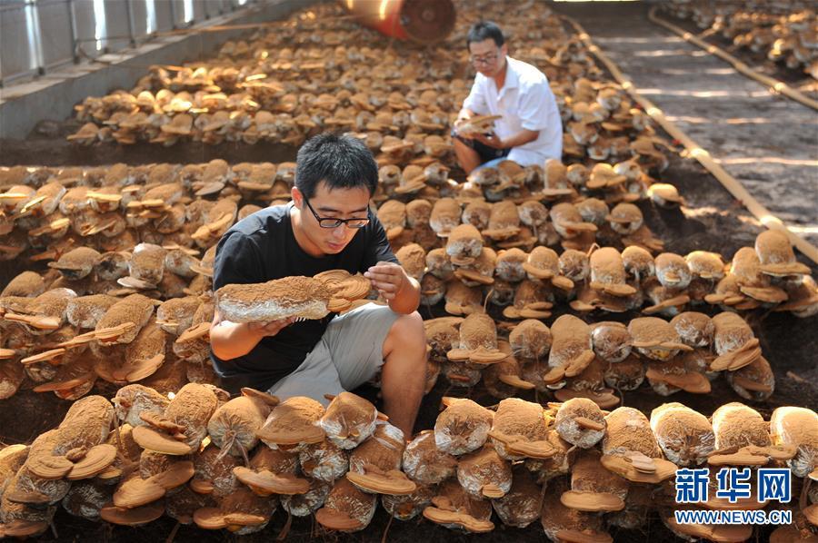 9月4日,韩子夜(前)和韩子南在种植园内观察灵芝生长情况。
