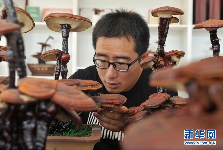 9月4日,韩子夜在灵芝种植园内整理灵芝盆景。