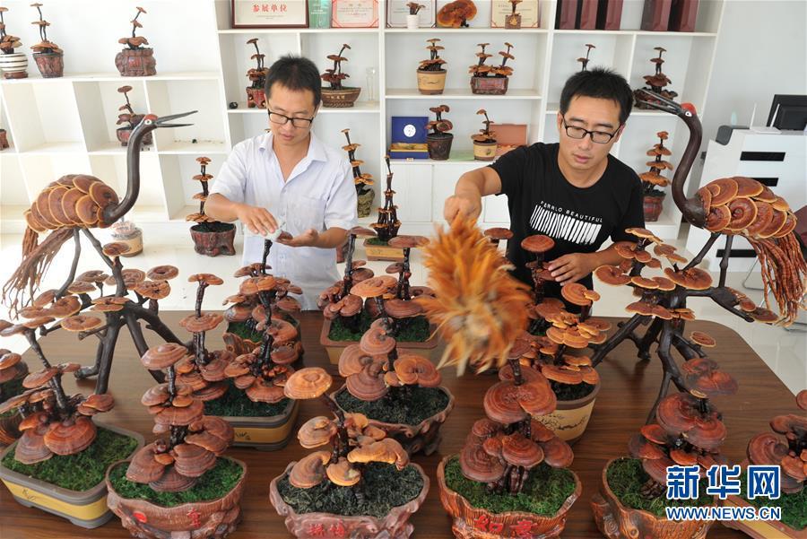9月4日,韩子南(左)和韩子夜在打理灵芝盆景。