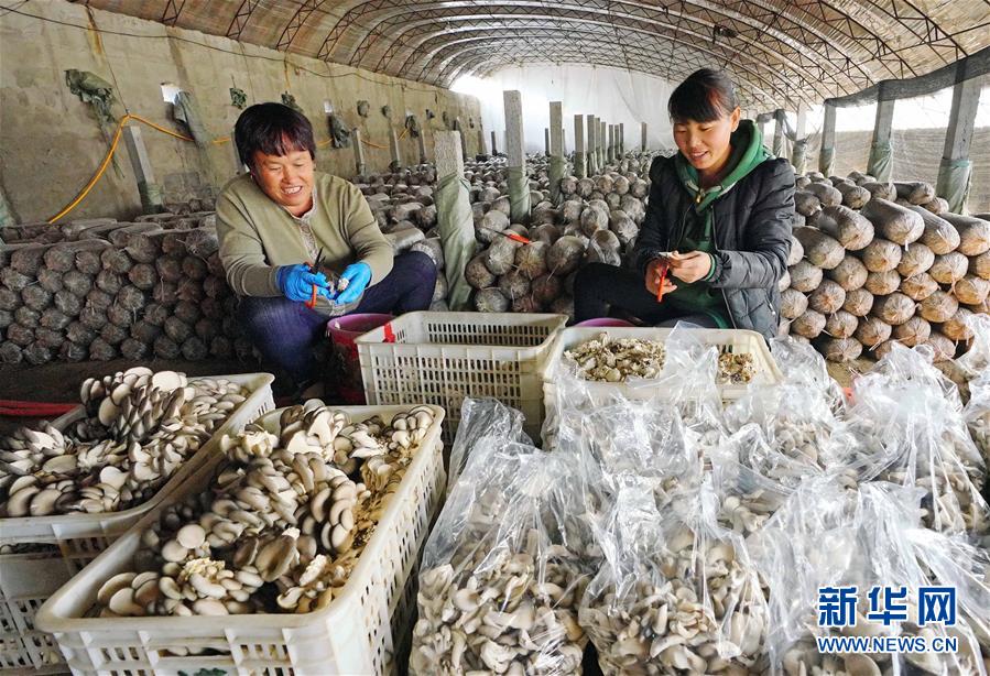 11月18日,在衡水市冀州区周村镇东高村食用菌种植基地的大棚里,村民在整理蘑菇。