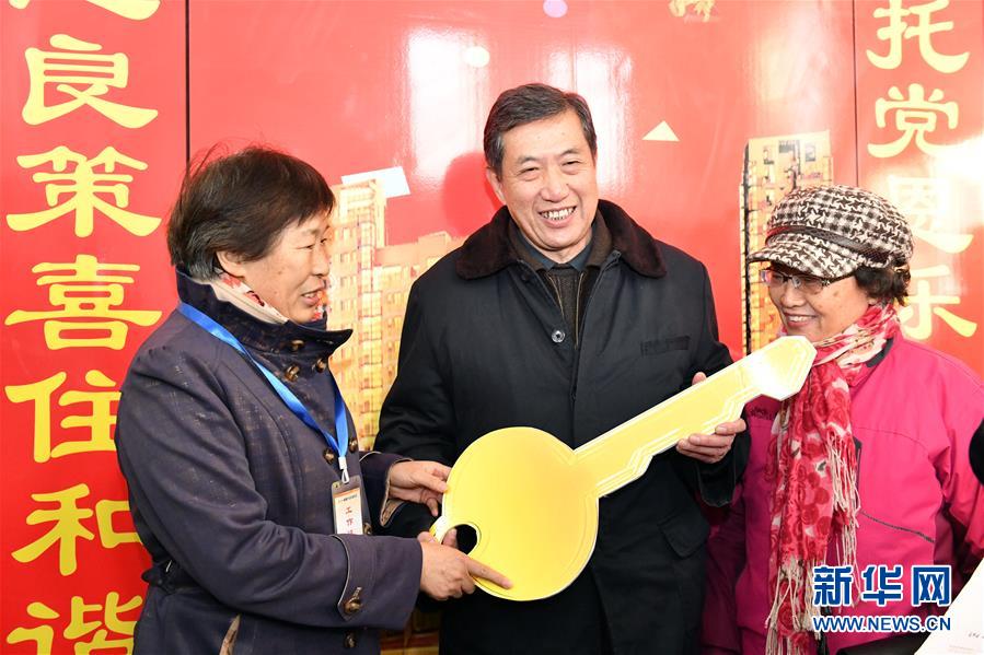 12月20日,回迁居民迟明德(中)成为和谐佳苑小区第一位办理回迁入住的居民。 当日,济南市槐荫区经十一路棚户区改造项目——和谐佳苑小区正式交付居民回迁安居。作为济南市槐荫区头号民生工程,本项目共17栋安置楼,实现棚户区居民“出棚进楼”,改善安居环境。 新华社记者 郭绪雷 摄