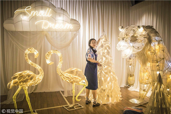 2018年5月6日,广州,在天河区一家大商场办个展时,用纸片做成的北极熊、大松树、火烈鸟、纸房子在光线的配合下美轮美奂,吸引了很多顾客驻足。“几乎每个人一看到,都会走进那个梦幻的场景里,和这些纸雕一起合影。”图片摄于2018年5月6日。南塘/视觉中国
