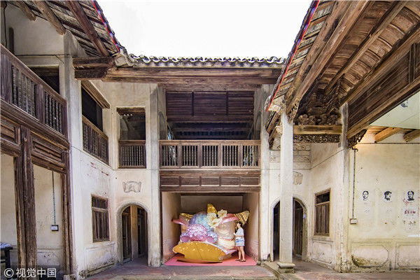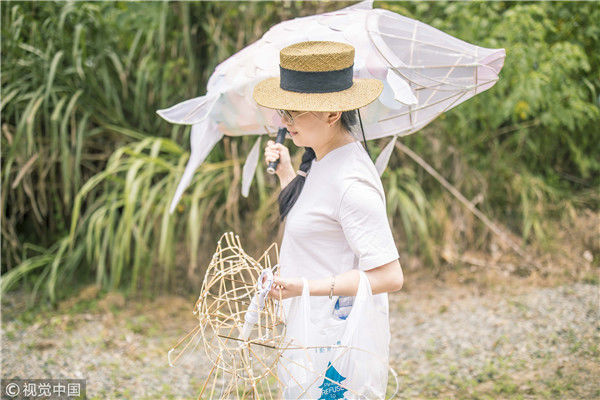2018年8月10日,广东揭阳,温秋雯把狮子头扒得只剩下骨架和包布,之后将不同颜色的纸片裁剪成三角形、鳞片形等不同形状,作为装饰狮子的皮毛,粘在狮子身上,狮子的鼻子则是用彩纸条以手鞠的方式缠绕而成,在狮头内部安装了一盏白炽灯,一打开电灯,萌态可掬的狮子便呈现在人们眼前。纸片的颜色以淡粉、淡绿、浅白色为主,就这样,人们平时印象中威猛的南狮,被改装得萌萌的。图为2018年8月10日,广东省梅州市,温秋雯和她的纸雕作品。