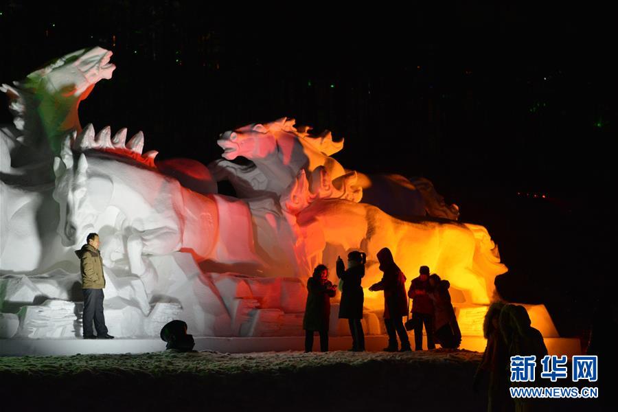 12月21日,游客在冰雪节开幕式上参观雪雕。