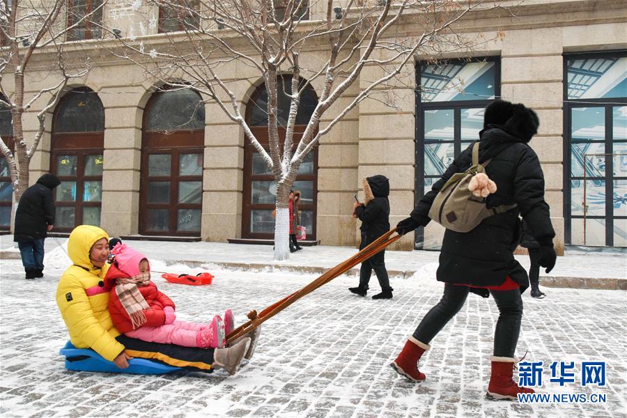 12月21日,游客在哈尔滨中央大街玩耍。当日,“冰城”哈尔滨迎来降雪天气,整个城市变得银装素裹。新华社记者韩宇摄