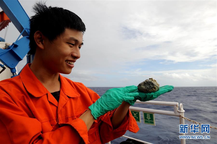 科考团队成员林刚展示在泥火山采集到的蛇纹石样品(12月20日摄)。