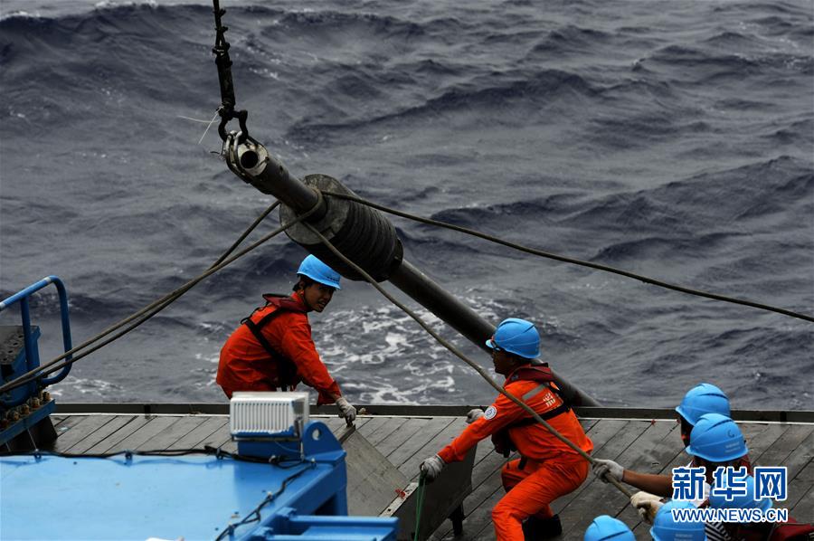 科考团队成员在船上布放重力柱(12月21日摄)。