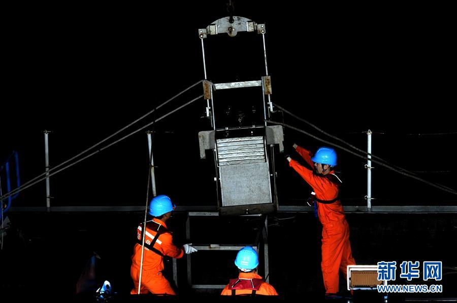 科考团队成员在船上回收箱式采样器(12月20日摄)。