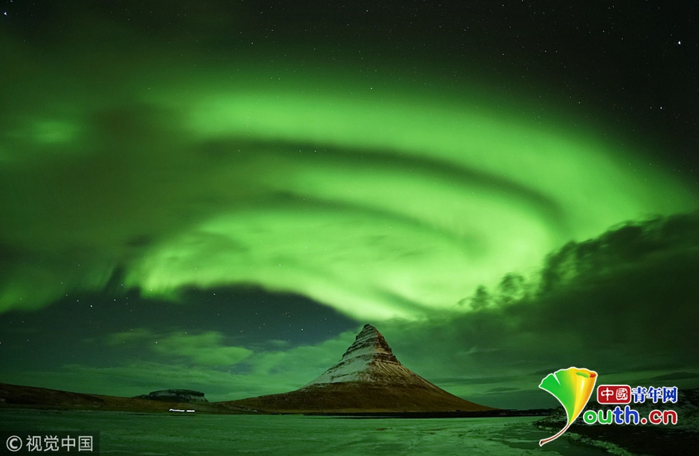 近日,冰岛西海岸高463米的Kirkjufell山上空出现极光。