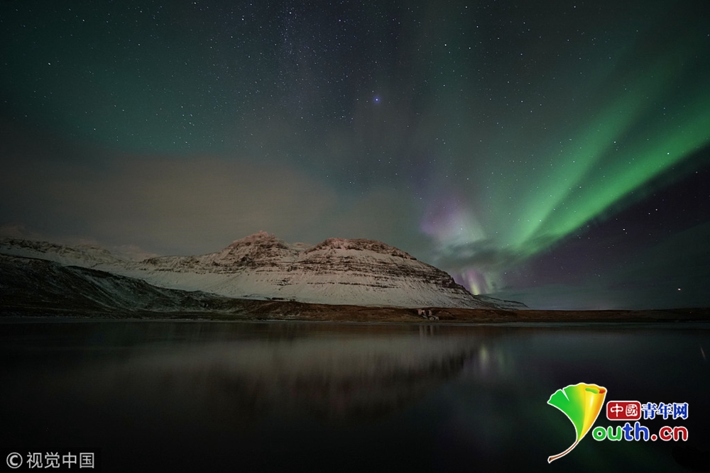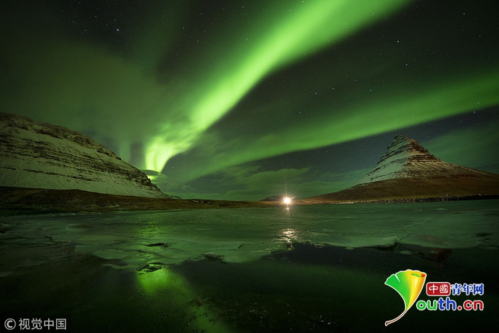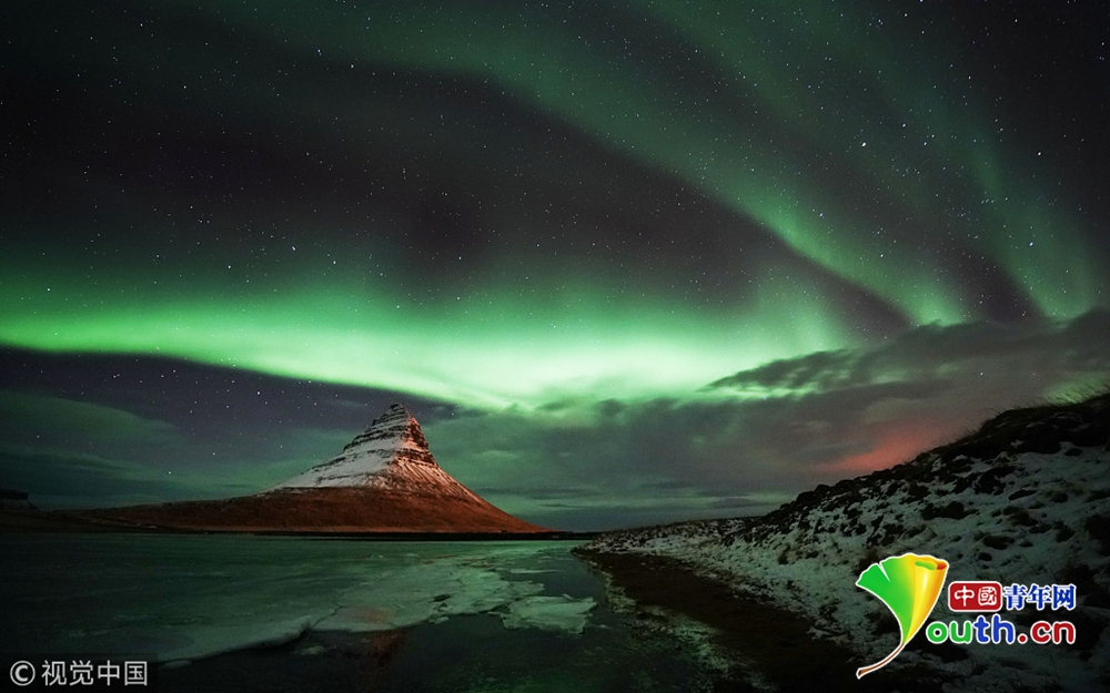 近日,冰岛西海岸高463米的Kirkjufell山上空出现极光。