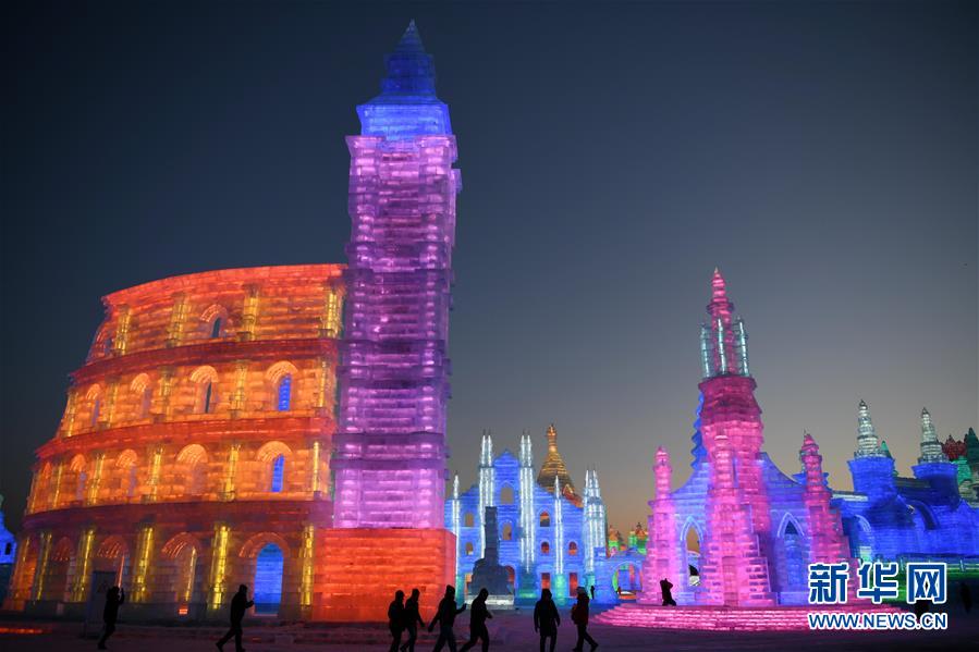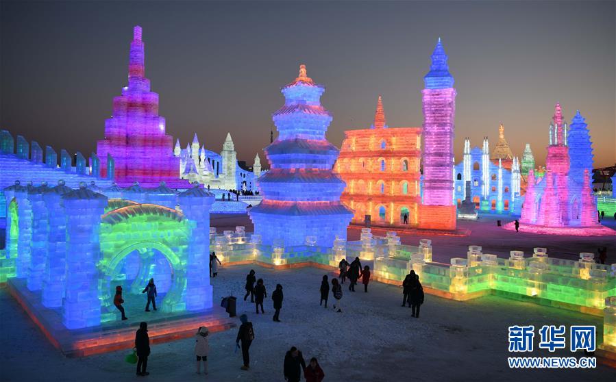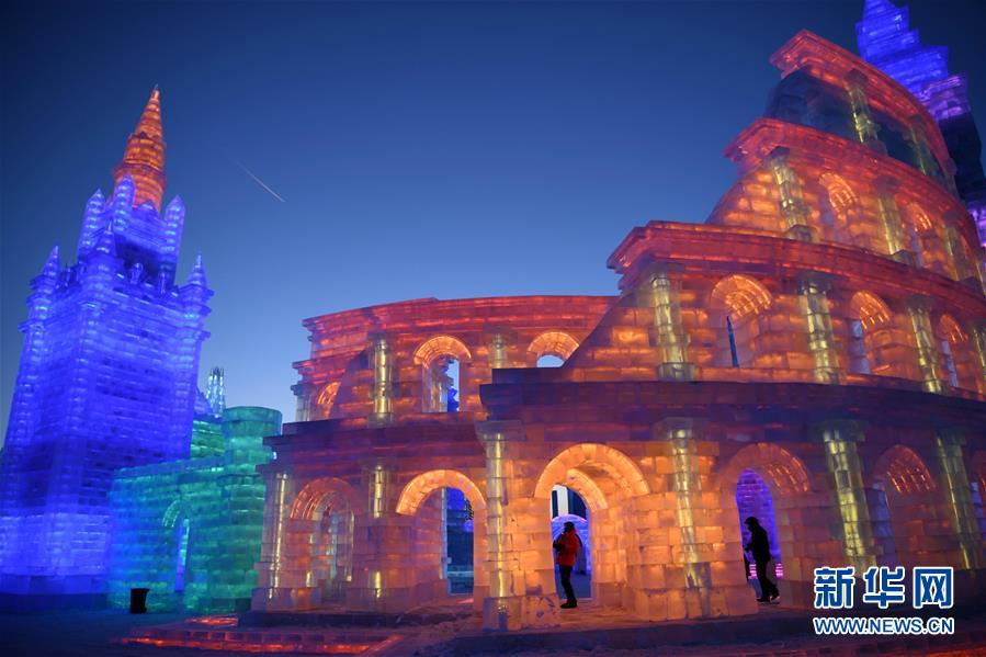 12月23日,游客在哈尔滨冰雪大世界园区游玩。