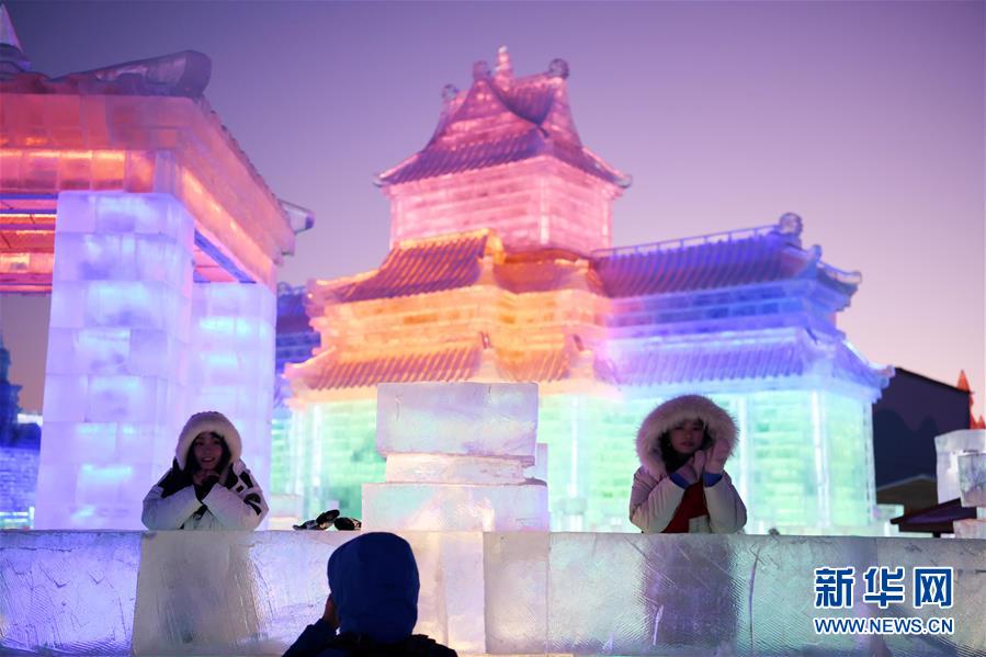 12月23日,游客在哈尔滨冰雪大世界园区拍照。
