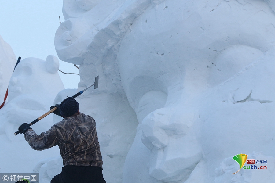 国内最大的雪雕盛会太阳岛雪博会正在紧锣密鼓建设中,部分雪雕雏形已现,雪雕师正在精雕细刻打磨中。