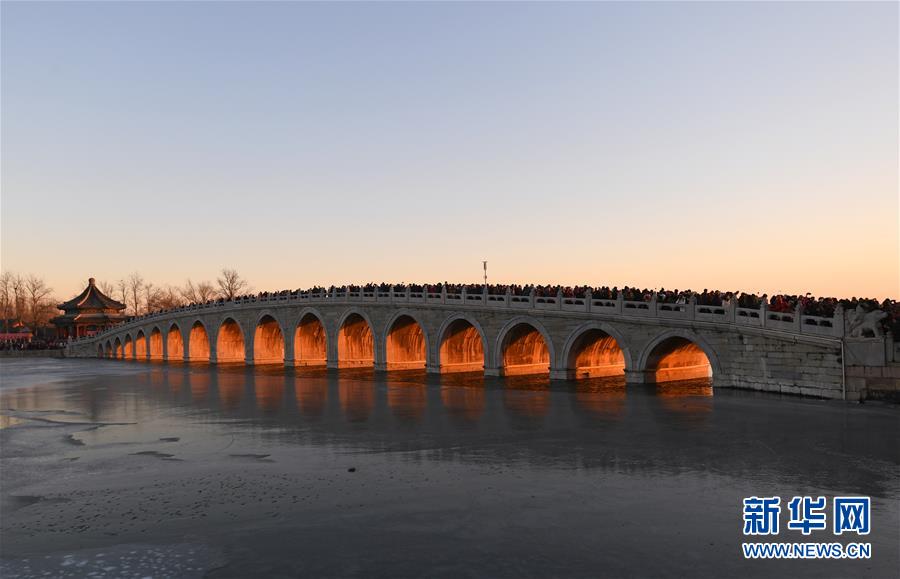 这是12月23日拍摄的颐和园十七孔桥“金光穿洞”美景。 当日,北京颐和园十七孔桥出现“金光穿洞”美景,吸引许多游客和摄影爱好者前来观赏拍摄。 新华社记者陈晔华摄