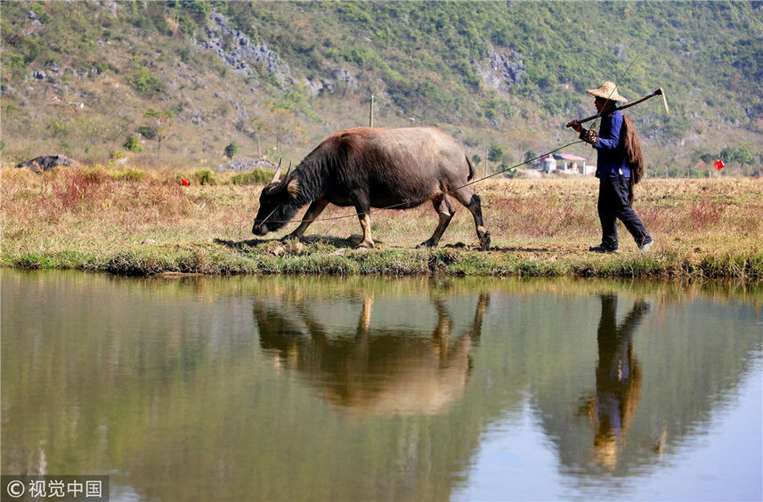 12月17日,在广西桂林的临桂区田心村这座叫做状元桥的小桥上,刚吃过午饭,老许和他的水牛搭档又要开始一场生态演出了。