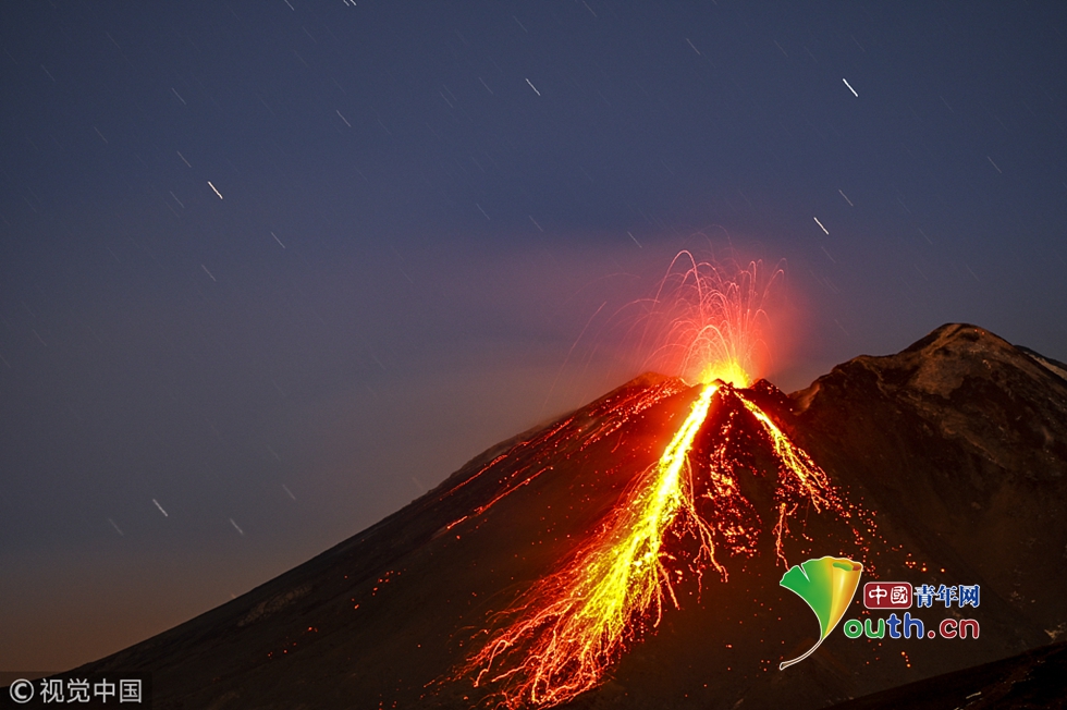 意大利埃特纳火山喷发 大量岩浆照亮火山口