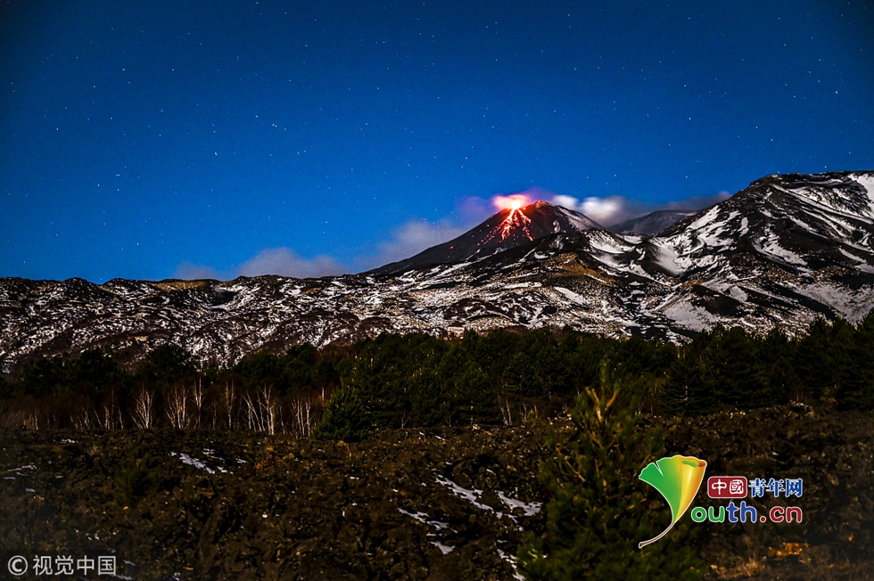 意大利埃特纳火山喷发 大量岩浆照亮火山口