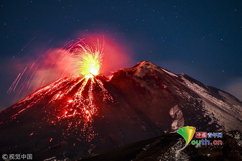 意大利埃特纳火山喷发 大量岩浆照亮火山口
