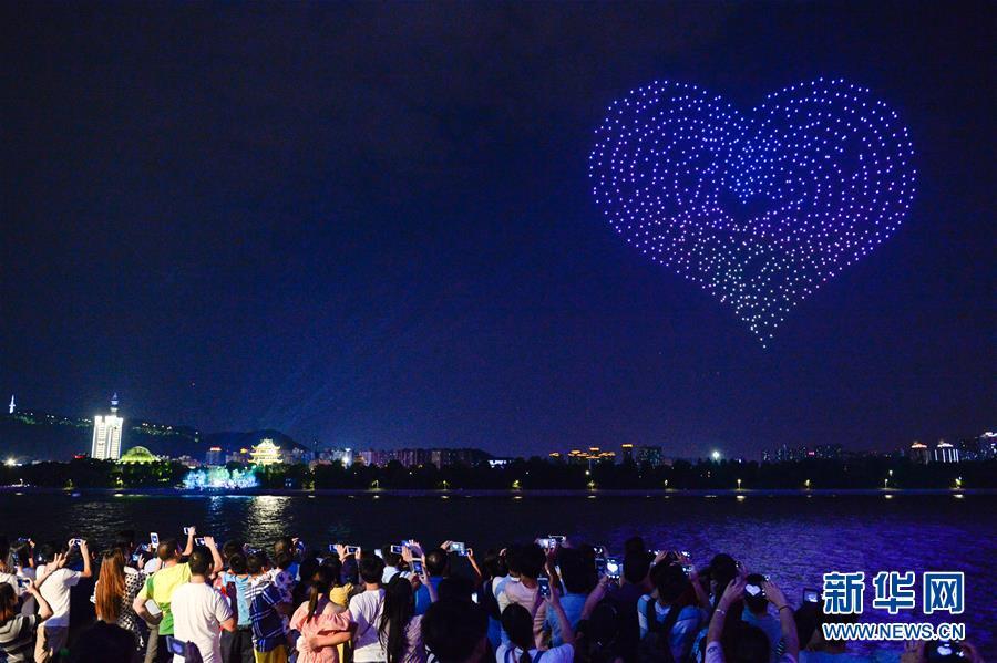 8月16日,无人机在湖南长沙橘子洲头摆出爱心图案。 在即将过去的2018年,各地摄影师用镜头记录下四季中国。大江南北,一幅幅色彩斑斓的美丽画卷徐徐展开。 新华社记者 张笑宇 摄