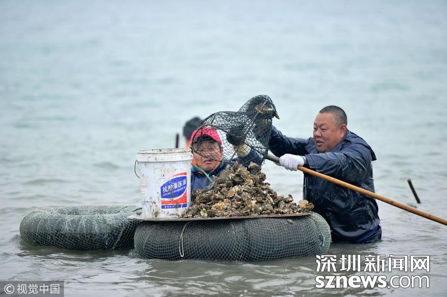 深圳新闻网2018年12月25日讯 二十四节气冬至适逢天文大潮,西海岸新区唐岛湾南岸,来自附近十余公里甚至青岛市区的市民来到退潮后的湾底,在齐腰深的海水中挖拾牡蛎(海蛎子)或在沙滩上挖拾蛤蜊。经过近2个多小时的辛勤劳作,市民们收获满满返回。