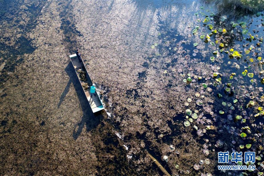 工作人员清理水生植物,保持洱海水体清洁(11月16日摄)。