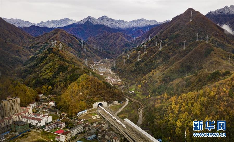 11月5日,一列动车从陕西省汉中市佛坪站驶过(无人机拍摄)。 新华社记者陶明摄