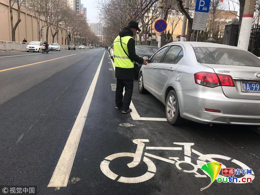 现场,文化宫路与友爱路口附近,新铺好的路面被划上了崭新的行车线和停车位标线。从文化宫路和友爱路交叉口向北,道路东侧的非机动车道被停车位占去后,仅剩下0.8米左右的宽度。同样在路口南侧,道路西侧的非机动车道也被新划的停车位占去,仅剩不足1米的宽度。