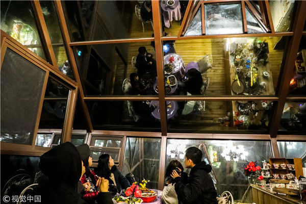 2018年12月17日,广西桂林,阳朔县遇龙河畔。夜色中的泡泡屋观景台。
