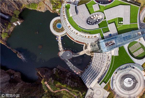 另外,大堂内有一根动态水幕,自下而上直通屋顶,水幕是根据深坑的景色变化、岩层变化而安排的设计故事体验。