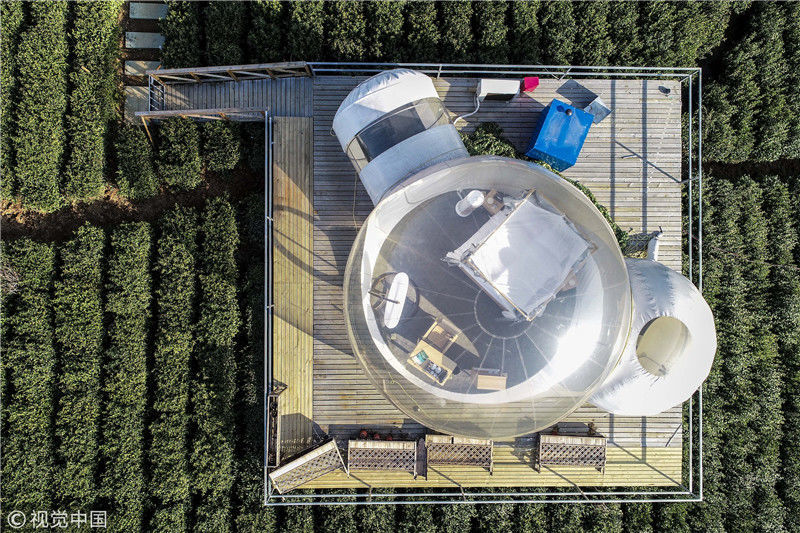 2018年12月18日,江苏常州金坛茅山百亩茶田中的帐篷酒店和泡泡屋美不胜收。这里打造的帐篷,泡泡屋极具特色,可以让游客与大自然零距离接触,这种形式的“酒店”十分撩人,深受欢迎。