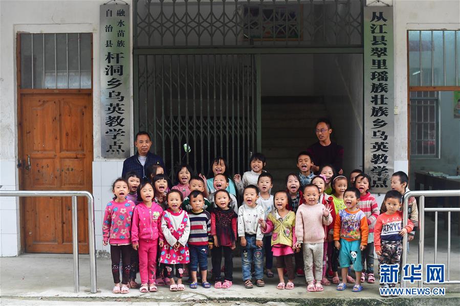 乌英教学点“一校跨两省区”,目前有广西籍学生18名,贵州籍学生9名,广西贵州籍老师各1名。 乌英苗寨位于黔桂交界的大苗山深处,共有140户,其中100户属广西柳州市融水苗族自治县杆洞乡党鸠村,40户属贵州省从江县翠里瑶族壮族乡南岑村。由于地处偏远,山多地少,经济发展缓慢,目前整个苗寨还有76户是贫困户。 面对艰巨的脱贫任务,当地党委政府在努力改善乌英苗寨公共基础设施的同时,因地制宜,带动群众积极发展特色产业。从2017年11月至今的一年多时间,这里发生了很大改变:10户村民新建了木楼,120多户完成“三改”(改厕改厨改圈),1名贫困考生考上大学,1户购买新汽车,4对新人举行了婚礼,宽带网络开始进入贫困户家庭,苗寨修建了新的办公大楼和戏台,安装了4盏太阳能路灯,购买了40多个新芦笙,水果种植专业合作社2018年种植的百香果也开始有所收获,18户贫困户进入脱贫公示阶段…… 乌英苗寨600多名黔桂苗族群众,正在用勤劳的手,拔穷根摘穷帽,一起创造美好的明天。