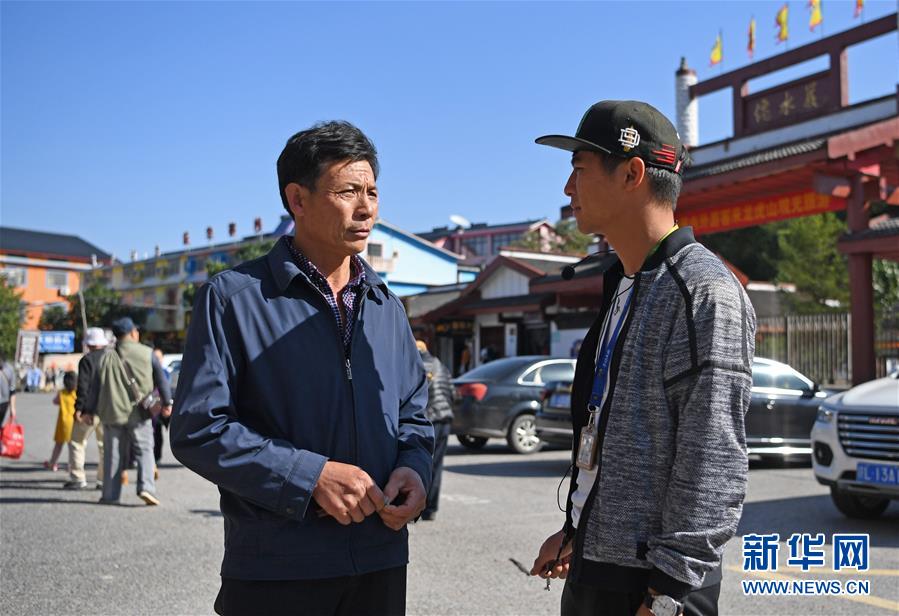 在龙虎山景区门口,舒港发嘱咐做导游的小儿子舒志刚注意游客的安全(10月28日摄)。