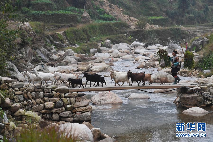 劳作归来的村民潘妹迫赶着羊群过河(2017年11月10日摄)。