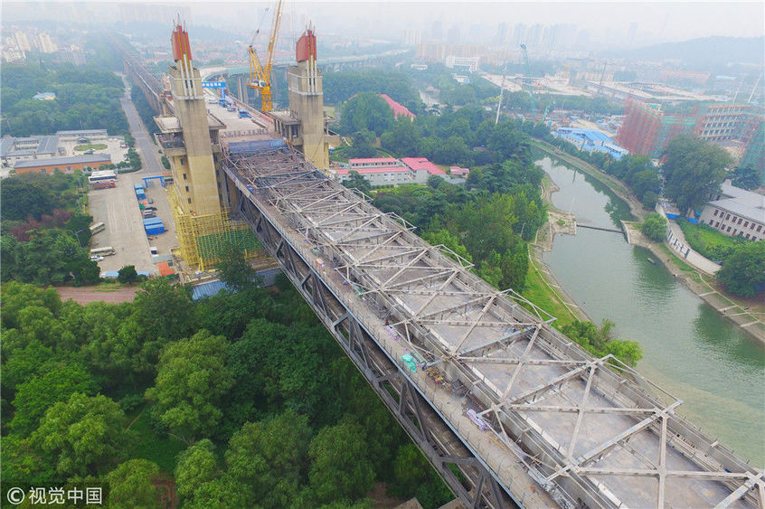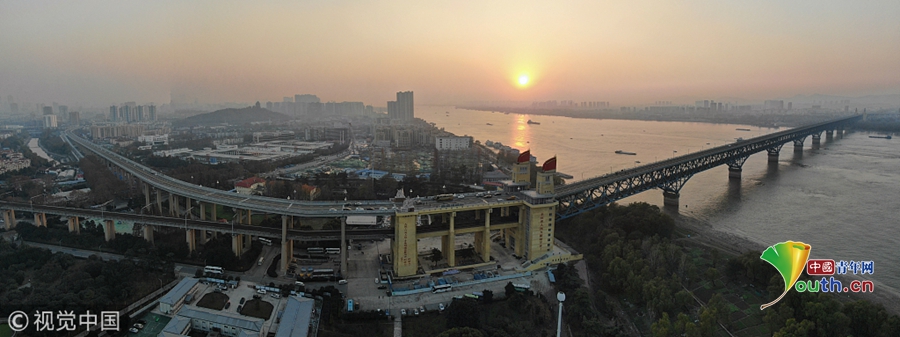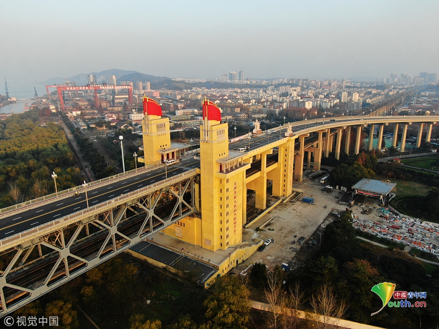 2017年9月19日,南京长江大桥正桥的混凝土面板已经全部拆除,仅剩交错纵横的钢桁架横跨在长江之上,从高空俯瞰犹如一条“钢铁巨龙”。