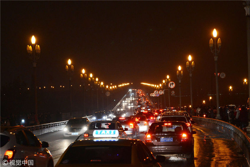 2016年10月28日晚,服役48年的南京长江大桥正式封闭,进入合同工期长达27个月的改造提升期。身为我国桥梁建设领域的扛鼎之作,南京长江大桥的此次封闭改造牵涉到公路繁忙、铁路风险、技术攻关、文物保护等诸多难点,不仅影响面广,而且社会关注度极高。如今,随着整个工程进入收尾阶段,即将于2018年12月底正式通车。图为2018年12月13日,夜幕降临,南京长江大桥归位后的玉兰花灯重新点亮。大桥玉兰花灯柱共有299根,每根灯柱上有5盏玉兰花灯,1大4小,一共1495盏。