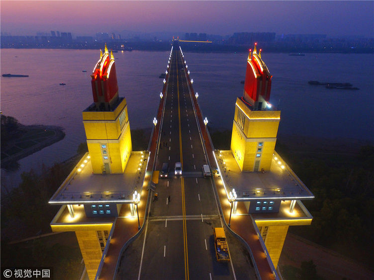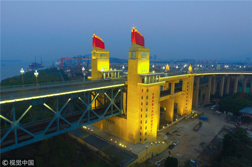 2018年12月13日,江苏南京,“一桥飞架南北,天堑变通途。”作为我国第一座自行设计和建造的双层铁路、公路两用桥,南京长江大桥在我国桥梁史上的重要地位不言而喻。从1968年建成后的48年间,它就如同一条巨龙,始终在长江上默默守护着人来车往。南京长江大桥上层是公路桥,下层为双轨复线铁路桥,连接津浦铁路与沪宁铁路干线,是我国南北交通要津和命脉。近年来,由于南京长江大桥公路桥的实际通行荷载远超原先设计标准,不仅桥面上拥堵常现,桥梁本身的种种“病害”也日益加深。图为2018年12月13日,夜幕降临,南京长江大桥归位后的玉兰花灯重新点亮。大桥玉兰花灯柱共有299根,每根灯柱上有5盏玉兰花灯,1大4小,一共1495盏。方东旭/视觉中国