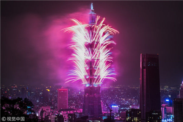 2018年1月1日,台北101大楼燃放焰火迎接新年的到来。