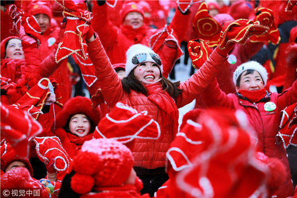 2017年12月31日,黑龙江黑河。近万民黑河市民和数十名俄罗斯游客,身穿“中国红”在中央街跳起热舞迎接新年。