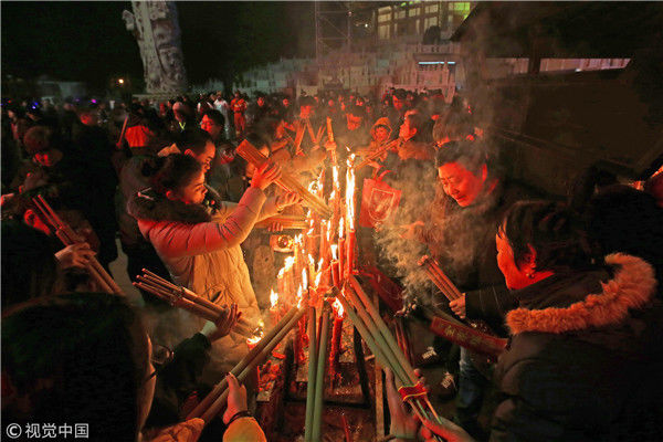 2018年12月31日晚,市民在江苏常州天宁宝塔广场烧香祈福。