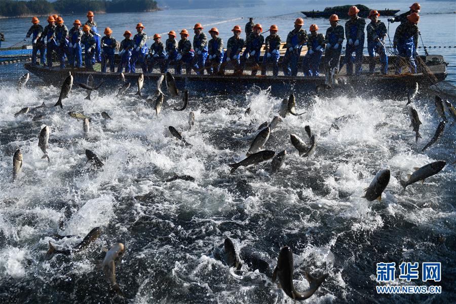 当日,浙江省杭州市淳安县千岛湖中心湖区上演巨网捕鱼,30余名捕捞队员经过半个多小时拉网,获得大丰收。