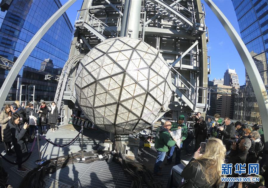 这是12月27日在美国纽约时报广场拍摄的水晶球安装现场。 每年12月31日晚,纽约时报广场都会举办跨年庆典,当午夜钟声响起之时,水晶球缓缓落下,庆祝新的一年到来。 新华社记者 张墨成 摄