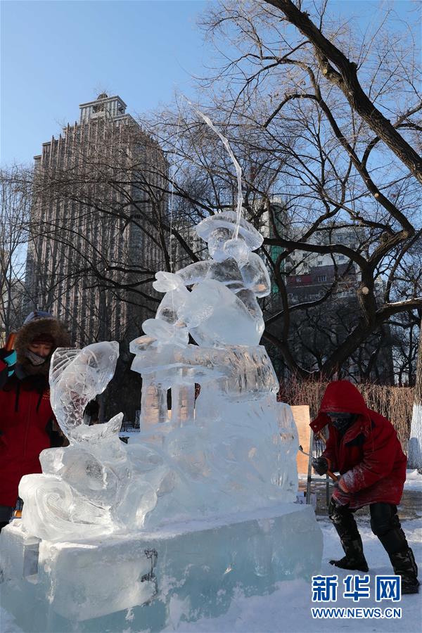12月27日,选手们在比赛中完善冰雕作品。 当日,第十六届黑龙江省大学生冰雕艺术设计创作大赛在哈尔滨兆麟公园落下帷幕,全省高校共有99支队伍参赛。 新华社记者曹霁阳摄