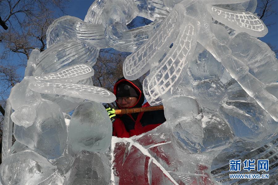 12月27日,选手在比赛中完善冰雕作品。 当日,第十六届黑龙江省大学生冰雕艺术设计创作大赛在哈尔滨兆麟公园落下帷幕,全省高校共有99支队伍参赛。 新华社记者曹霁阳摄